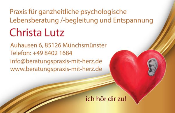 Tel.: 08402 1684E-Mail: info@beratungspraxis-mit-herz.deurl: www.beratungspraxis-mit-herz.de